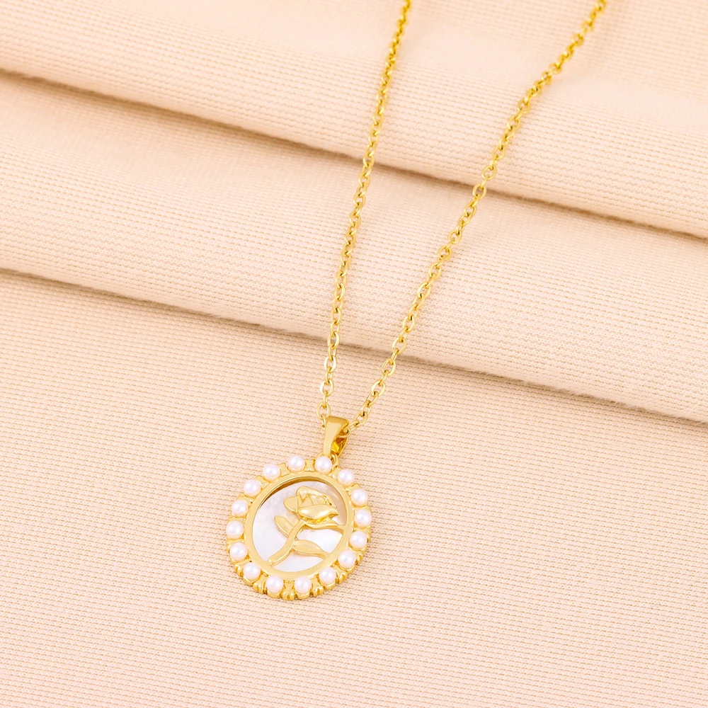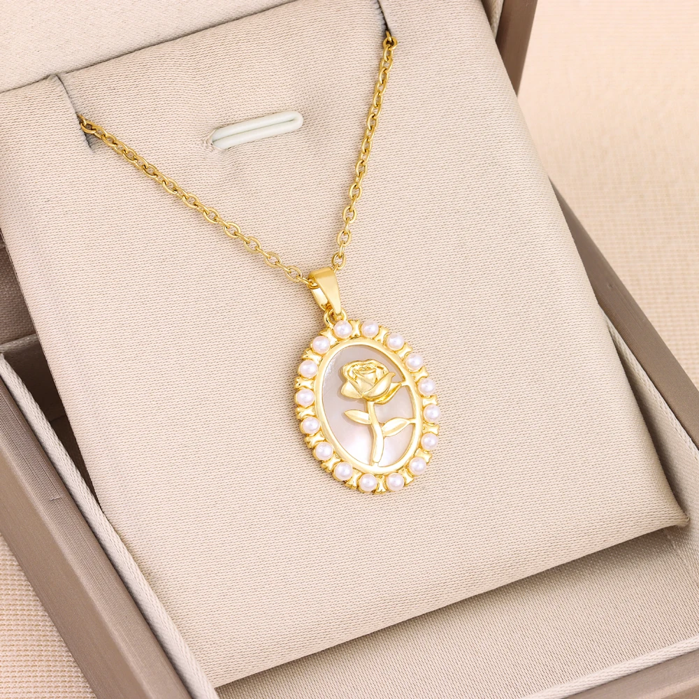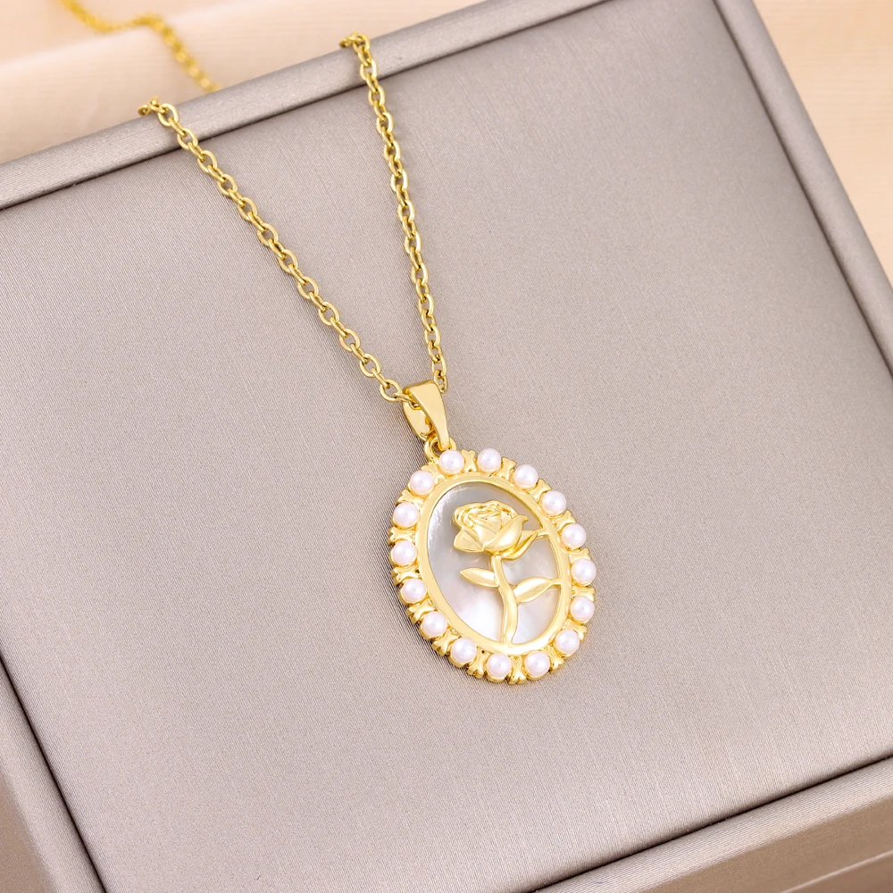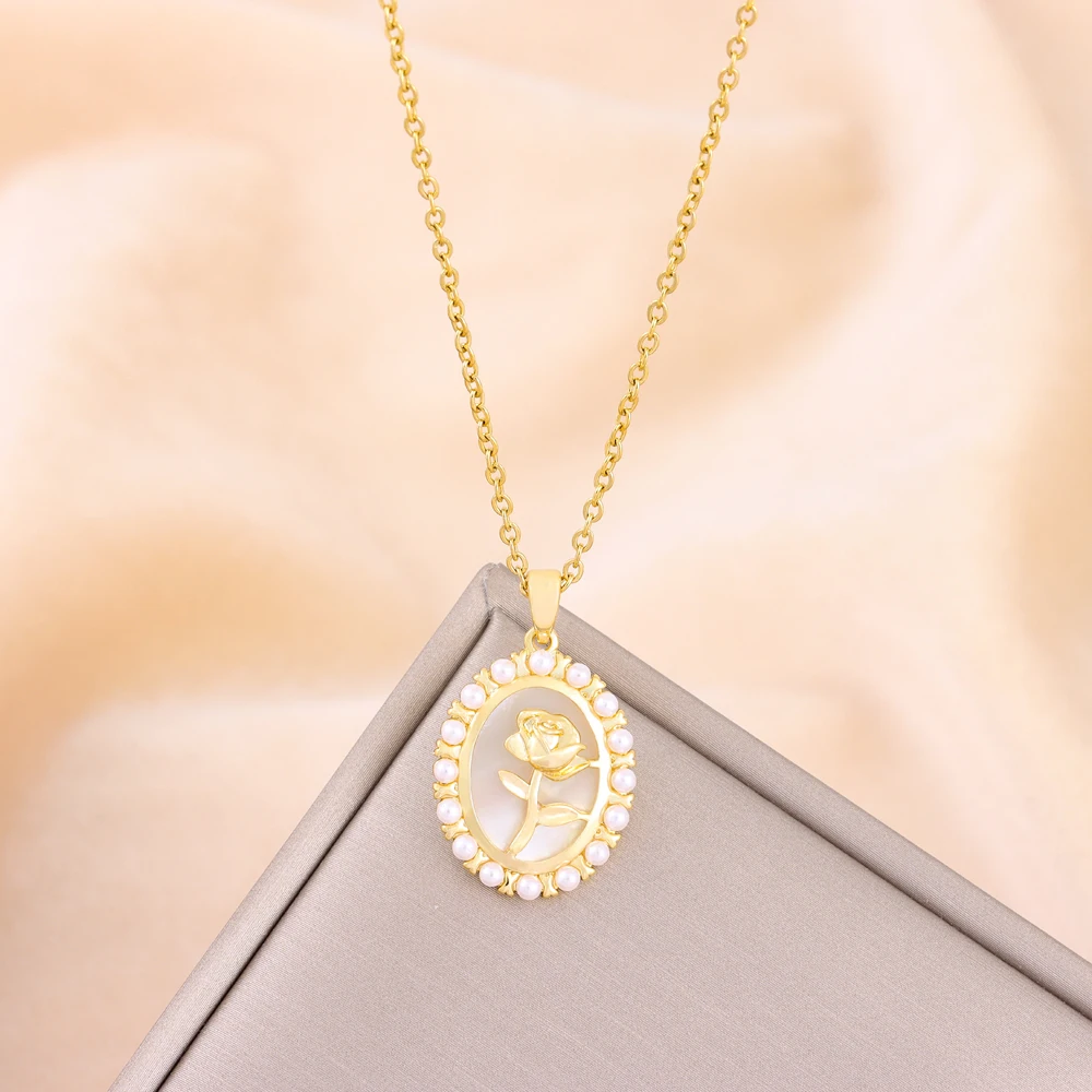 Nuevo en collares de acero inoxidable con colgante de rosa y perla ovalada de estilo Vintage para mujer, cadena elegante para el cuello, joyería al por mayor